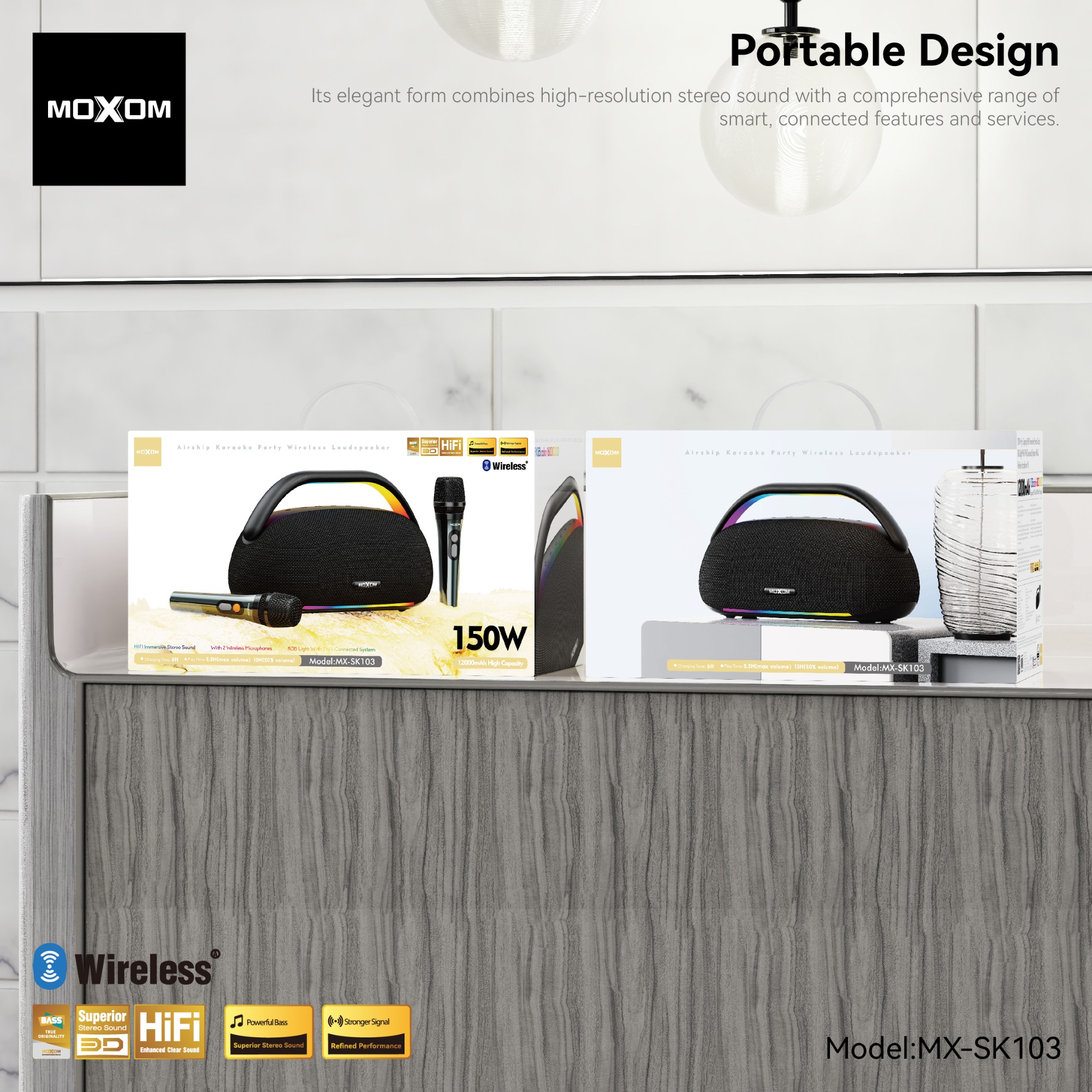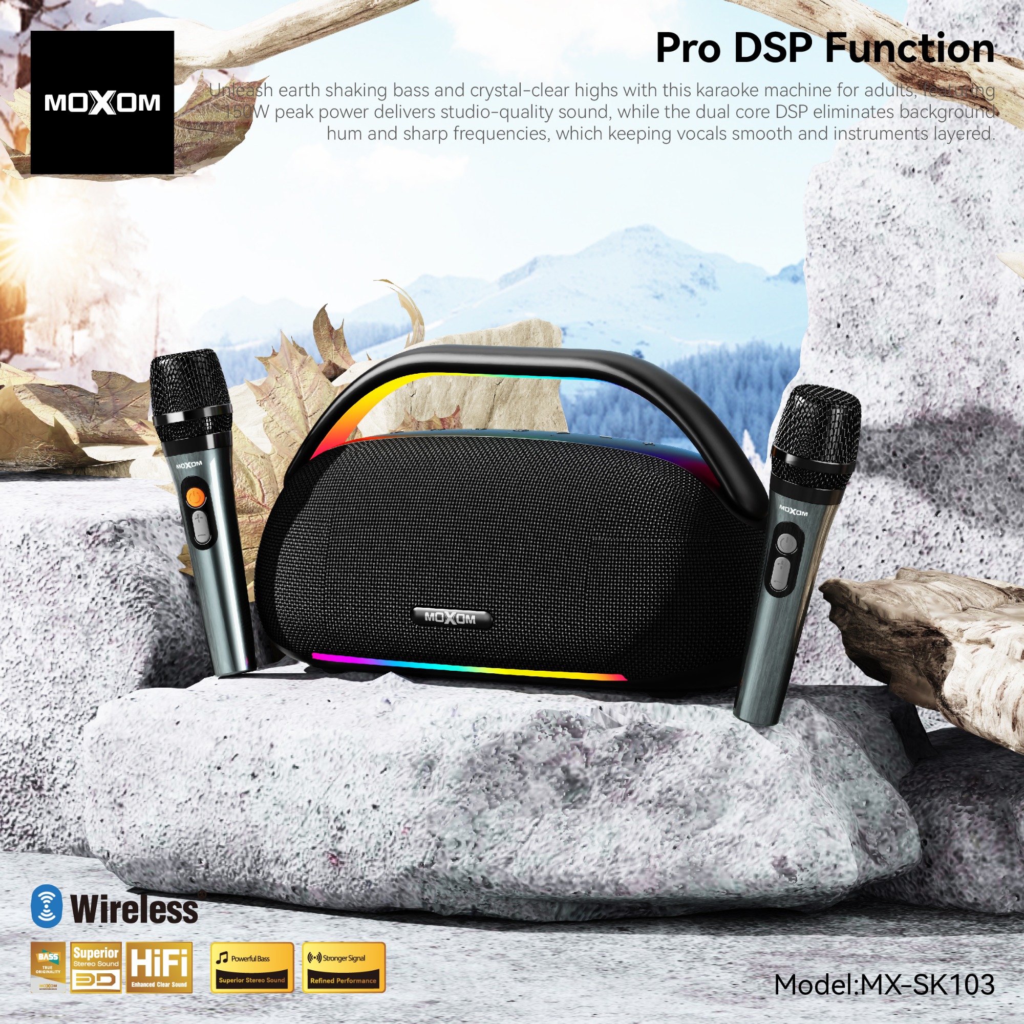 | Smarter, more flexible, and sounds better than ever. You no longer have to choose between advanced features, aesthetic beauty and room-filling sound. Now, you can have it all. Smart EQ Modes and TWS Modes. Switch between three EQ modes to dominate any scene: Indoor mode (deep bass + balanced mids) for cozy jam sessions or outdoor mode to blast your karaoke speaker across parks, beaches, or patio parties. Sync two speakers via TWS mode to create immersive stereo sound, which seamlessly pairing left and right channels for cinematic 360° audio. Powered by a 12,000mAh battery. This party speaker delivers 13 hours of bonfire jams or poolside karaoke. Charge once, rage all weekend Pro DSP Function. Unleash earth shaking bass and crystal-clear highs with this karaoke machine for adults, featuring 150W peak power delivers studio-quality sound, while the dual core DSP eliminates background hum and sharp frequencies, which keeping vocals smooth and instruments layered. Portable Design,Take It Everywhere. Its elegant form combines high-resolution stereo sound with a comprehensive range of smart, connected features and services. Plug-Play, Pro Audio Inputs Turn any space into your stage! This versatile speaker supports AUX, TF cards, USB drives, and microphone/guitar inputs, transforming effortlessly into a karaoke machine, Compatible with Android, iOS, PC, and other systems, it delivers crystal-clear sound for any scenario. |