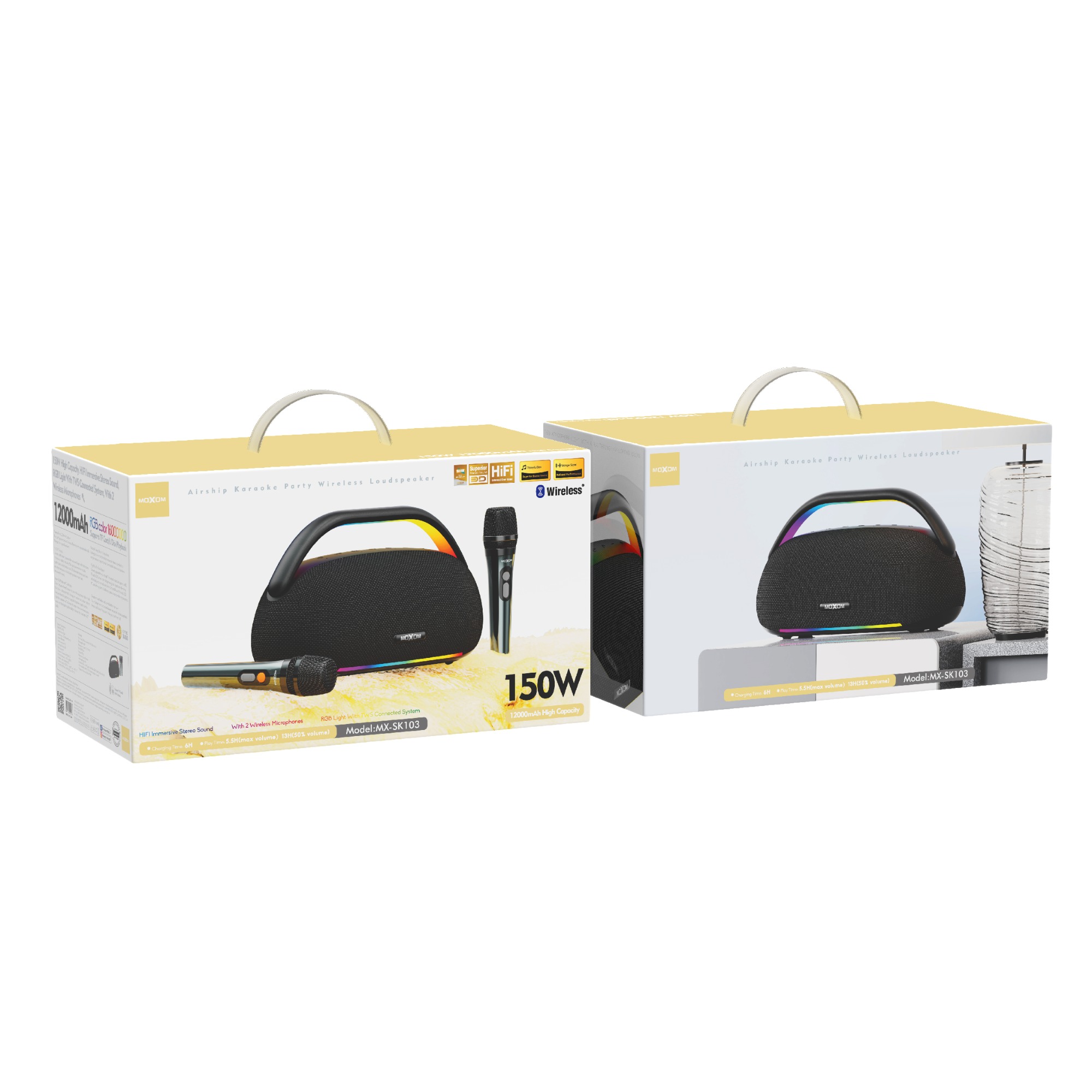 | Speaker Specification: Model:MX-SK103 Speaker Power:150W Speaker Size;190*114mm+48mm *2 Battery:11.1V/12000mAh Wireless Version: V5.0 Working Distance:12M TWS Range: 8m Frequency Response:40HZ-18KHZ Working Frequency :2.402-2.408GHz Wireless Audio Decoding:SBC Wireless Protocol:A2DP v1.3, AVRCP v1.6, HFP v1.7, HID v1.1, AVCTP v1.4, AVDTP v1.3, and SPP v1.2 S/N:80dB Play Time: 5.5H(max volume)13H(50% volume) Charging Time: 6H Charge port: Type-C DC5V/3A Size:35*15*19cm Weight:2.25kg Microphone Specification: Working Range:10m Sensitivity: Min.-45dB;Type -42dB;Max -39dB (0dB=1V/Pa,at 1KHz) S/N:Min.:60dB (at1KHz S,P,L=1Pa(A-Weighted Curve) Frequency Response:90Hz~15KHz |