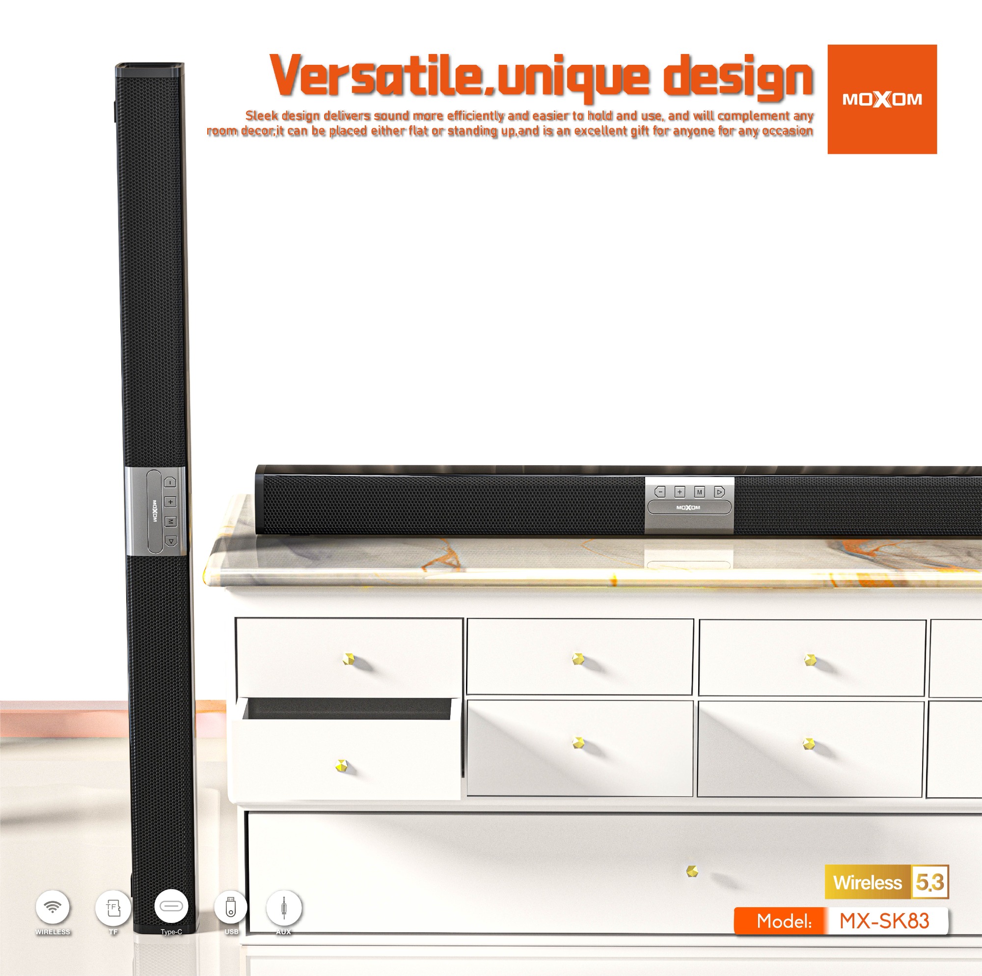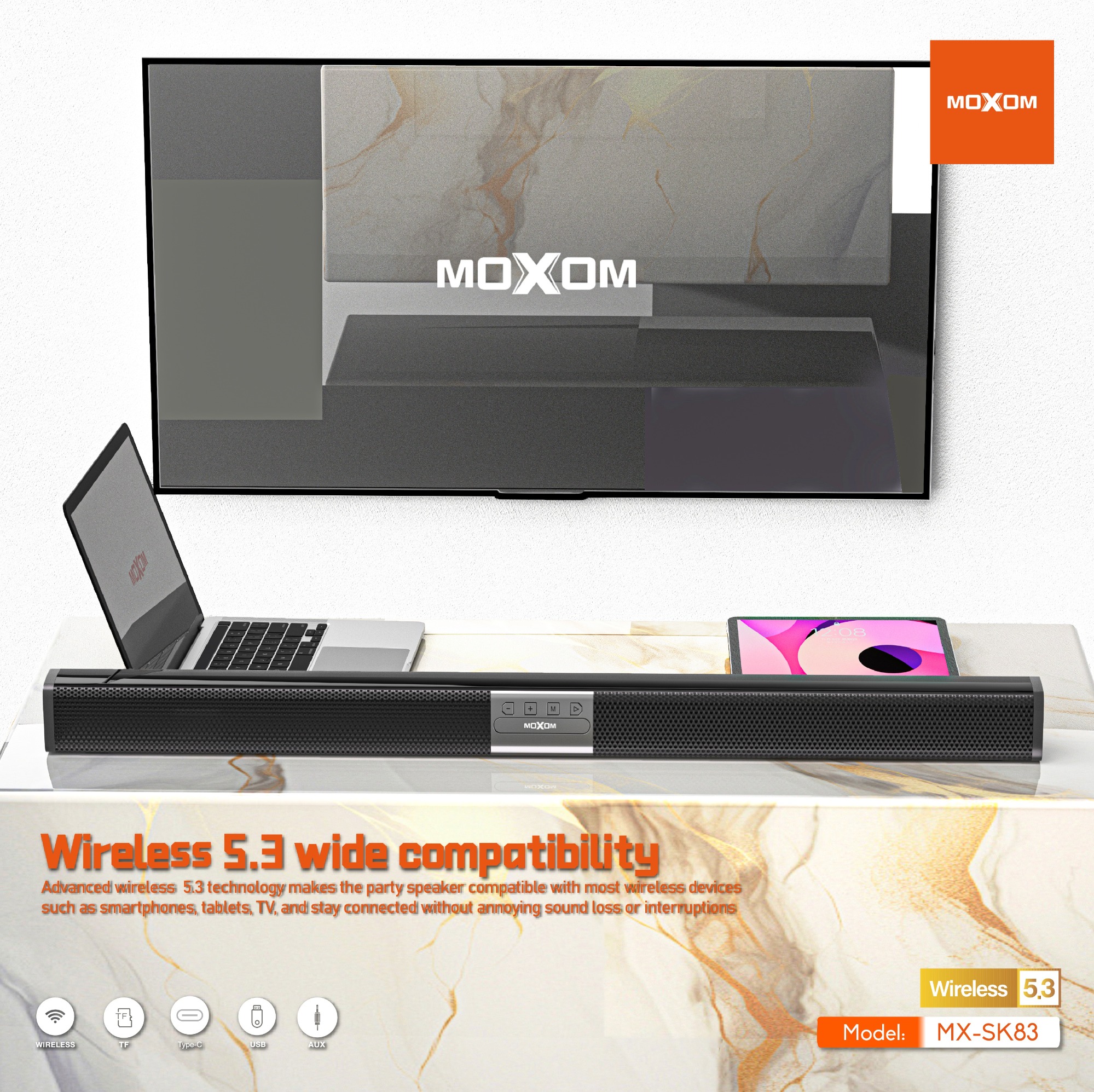 Insert the AUX cable into your TV and laptop to play the audio at any time,use a TF card and USB flash drives to enjoy different listening modes