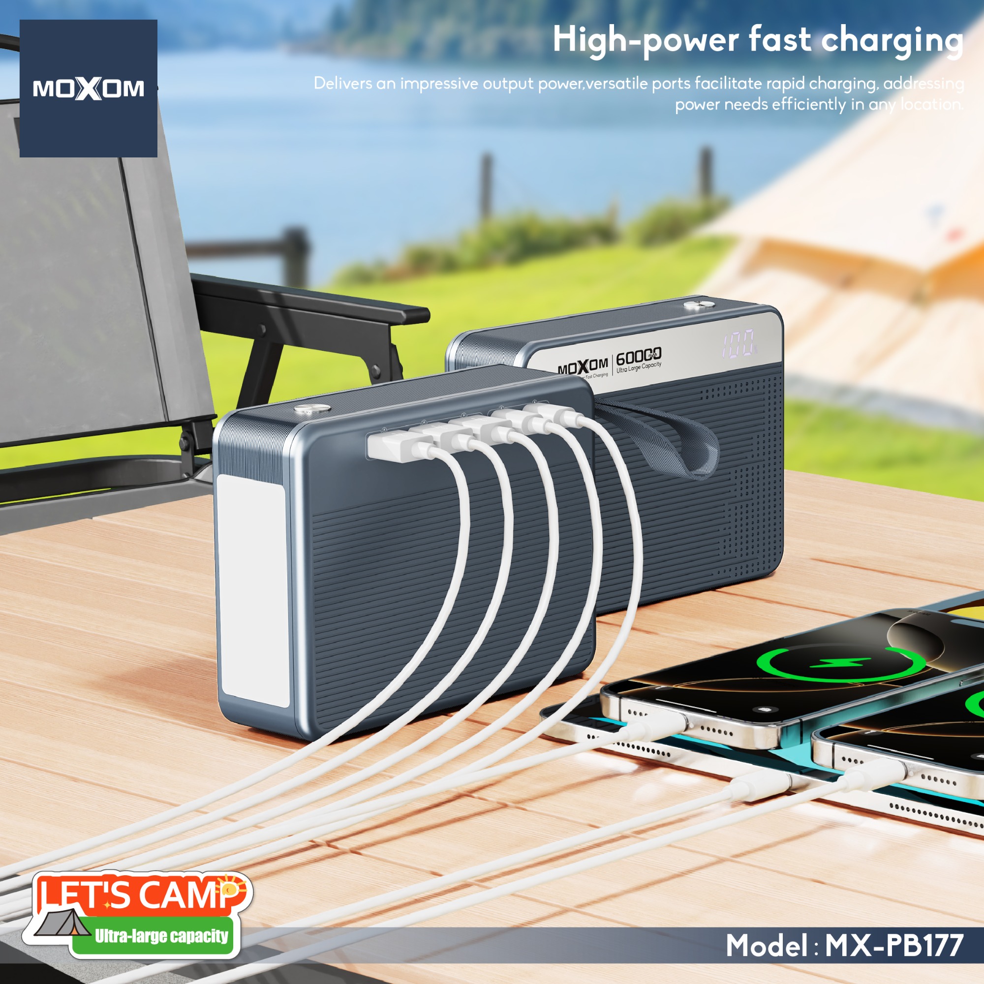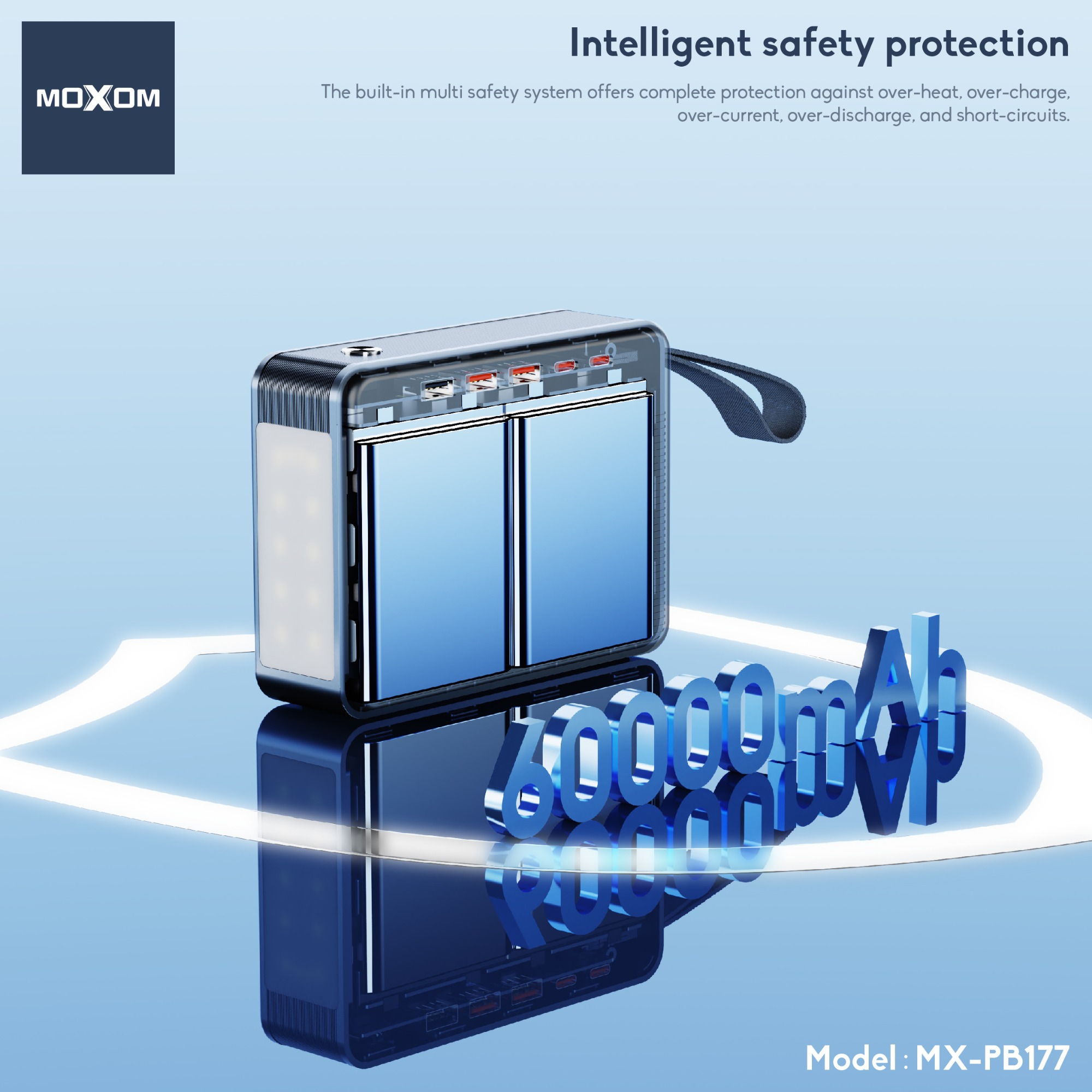 | Intelligent safety protection The built-in multi safety system offers complete protection against over-heat, over-charge, over-current, over-discharge, and short-circuits Equipped with LED flash light Long press to turn on the lights, providing a sense of security even when it's dark,such as camping, picnicking, cycling, exploring, safety patrols, and night walks can also accompany you Long lasting and durable enough for peace of mind With 60000mAh capacity in each portable power bank, you’ll have enough juice to keep your devices running for days,perfect for long trips or outdoor adventures High-power fast charging Elevate your charging experience with our cutting-edge power bank,it's optimized to deliver a whopping 27W of power, ensuring lightning-fast charging More useful features Power bank has a built-in high-precision intelligent LCD digital display that accurately reflects the percentage of power remaining,allows you to easily track the status of your battery Multi-port & powerful output Delivers an impressive output power,versatile ports facilitate rapid charging, addressing power needs efficiently in any location |