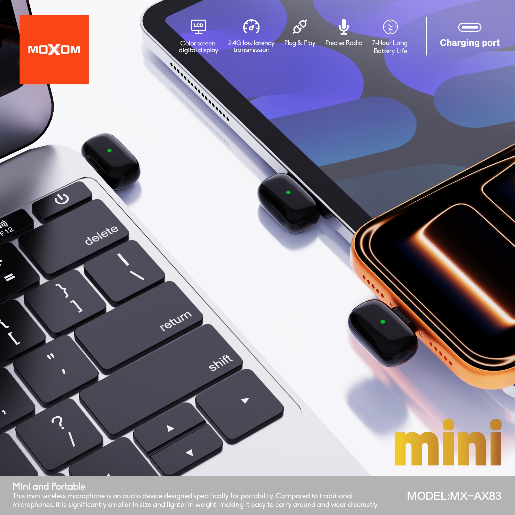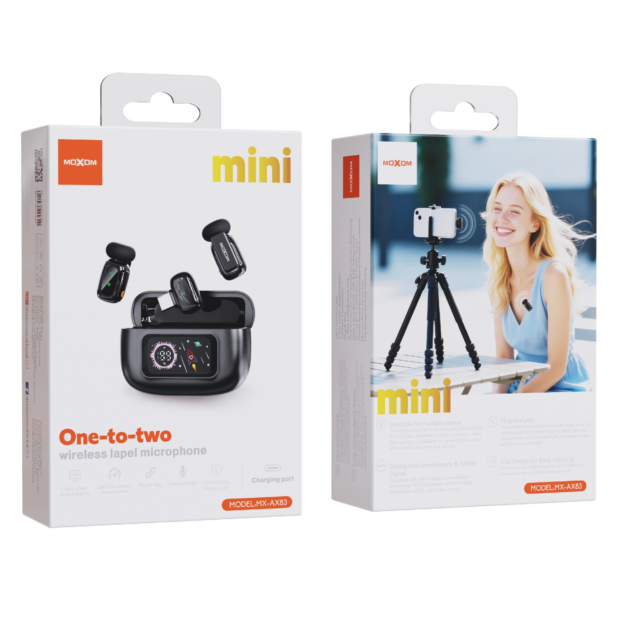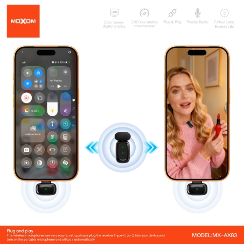 | Specification: Model: MX-AX83 Transmission distance:20M Sensitivity:-38dB Mic battery capacity:50mAh Charging case battery capacity: 320mAh Charging Voltage:DC 5V Receiver port:Type-C or Lightning Charging time:1.5H Charging time for Case:1.5H Endurance time:6-7H Charging port:Type-C Standby time:six months |