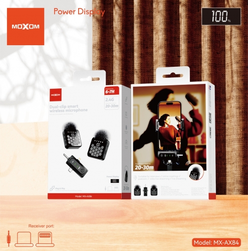 | Specification: Model: MX-AX84 Transmission distance:20-30m Mic battery capacity:200mAh Mic size:43.9mm*19.3mm*47.2mm Receiver port:Type-C/ Lightning/Plug 3.5mm Charging Voltage:DC 5V Charging time:1.5H Endurance time:6-7H Charging port:Type-C Standby time:six months |