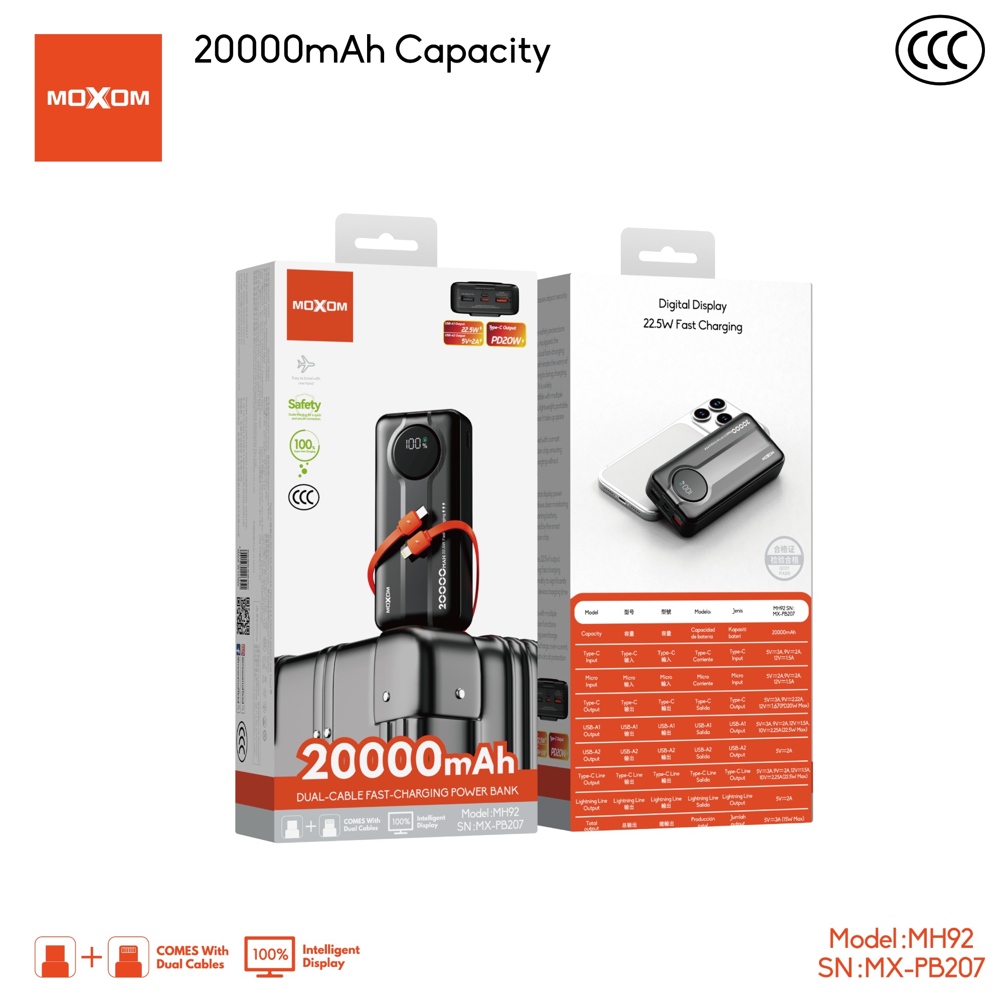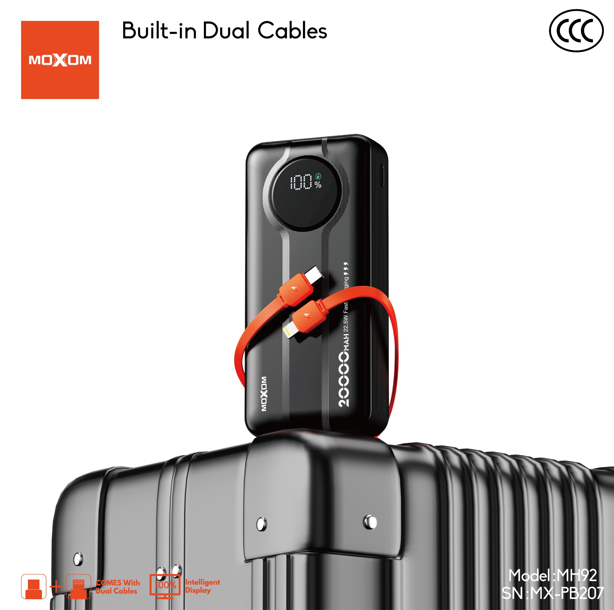 | 3C certified for air travel Easily passes airport security checks Built-in dual cables Multiple safety protections are fully equipped; the built-in dual cables eliminate the worry of forgetting to bring charging cables. It is widely compatible with multiple devices, lightweight, portable, and doesn't take up space Smart protection chip Equipped with a smart protection chip, ensuring safe charging without worries Digital display The digital display power bank allows clear monitoring of remaining battery; protected by the smart protection chip High-speed charging Features 22.5W output, providing fast charging functionality to significantly reduce device charging time Safety protection Comes with multiple protection functions including overcharge, over-discharge, over-current, and short-circuit protection |