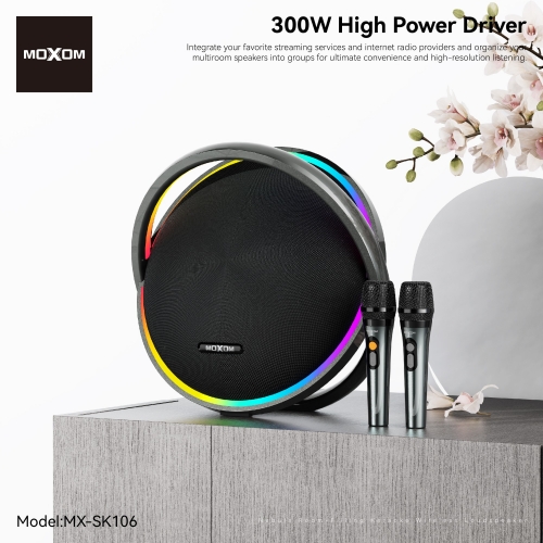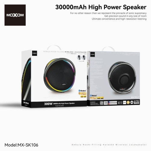 | Speaker Specification: Model:MX-SK106 Speaker Power:300W Speaker Size: Treble:38.8mm,Midrange: 65.5*6.5mm, Bass: 147*81mm Output: 250W Battery:18.5V/30000mAh Wireless Version: V5.3 Working Distance:12M TWS Range: 8m Track System:4.1 Frequency Response:40HZ-18KHZ Working Frequency :2.402-2.408GHz Wireless Audio Decoding:SBC Wireless Protocol:A2DP v1.3, AVRCP v1.6, HFP v1.7, HID v1.1, AVCTP v1.4, AVDTP v1.3, and SPP v1.2 Play Time: 4H(max volume) 9H(50% volume) Charging Time: 8-10H Charge port: Type-C DC5V/3A Size:L485.8*W198.5*H279.5mm Weight:8kg Microphone Specification: Working Range:10m Sensitivity: Min.-45dB;Type -42dB;Max -39dB (0dB=1V/Pa,at 1KHz) S/N:Min.:60dB (at1KHz S,P,L=1Pa(A-Weighted Curve) Frequency Response:90Hz~15KHz |