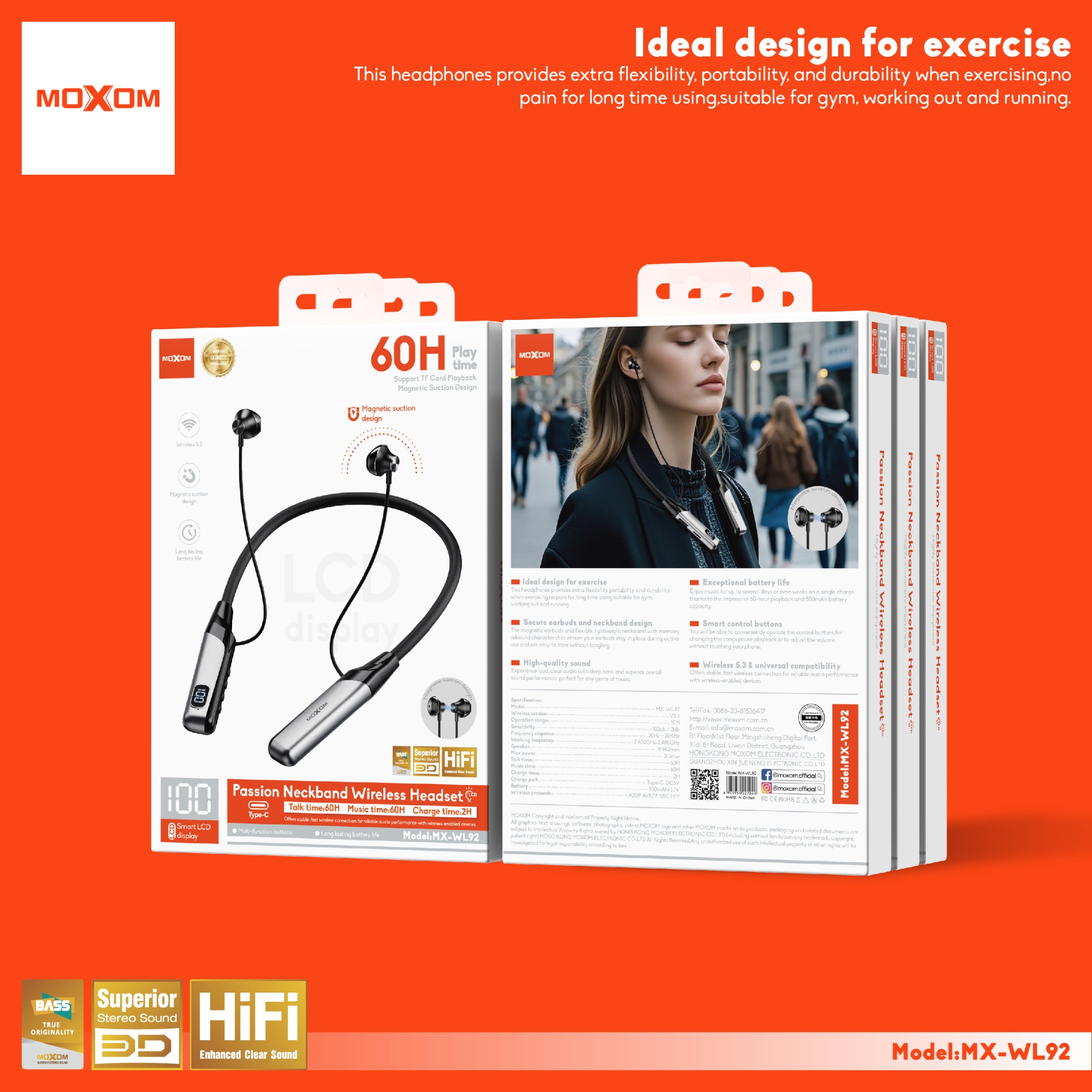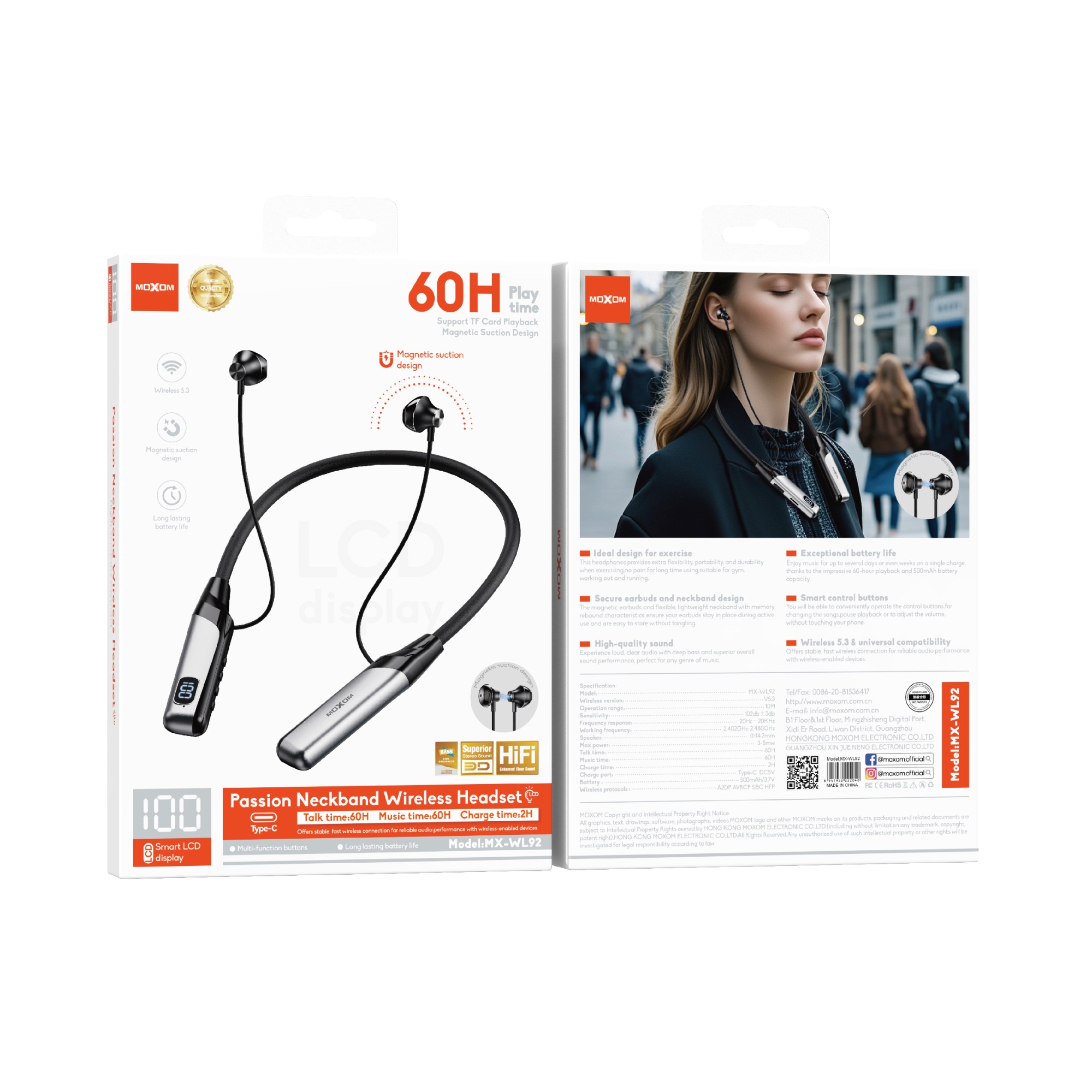 | Specification: Model:MX-WL92 Wireless version:V5.3 Operation range:10M Sensitivity: 102db±3db Frequency response:20Hz~20KHz Working frequency:2.402GHz-2.480GHz Speaker:Ф14.2mm Max power:3-5mw Talk time:60H Music time:60H Charge time:2H Charge port:Type-C DC5V Battery :500mAh/3.7V Wireless protocols:A2DP AVRCP SBC HFP |
