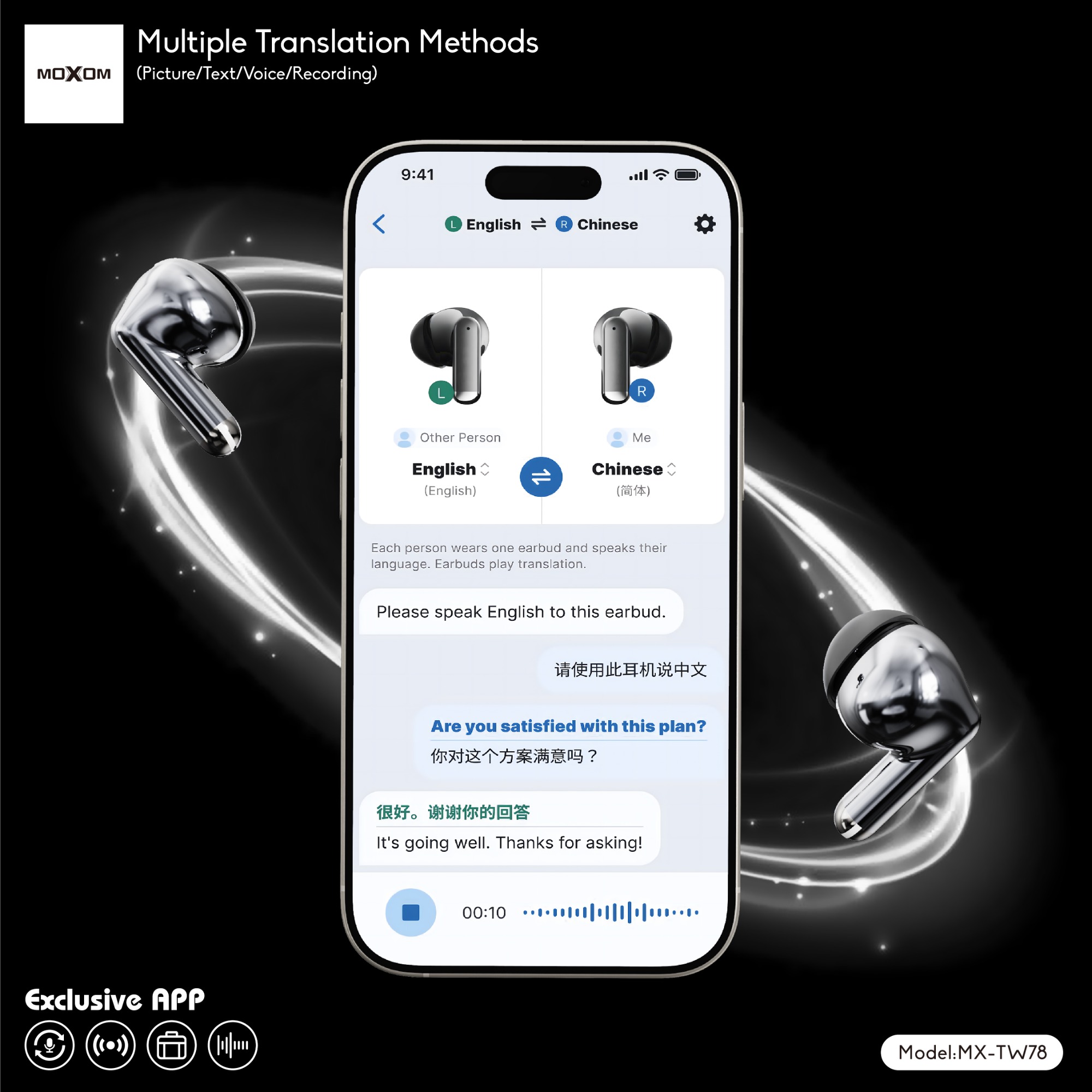 Real time recording of translation, simultaneous interpretation, face-to-face translation,the translation of the phone and headset can be switched at any time,no more delays, just smooth, instant understanding