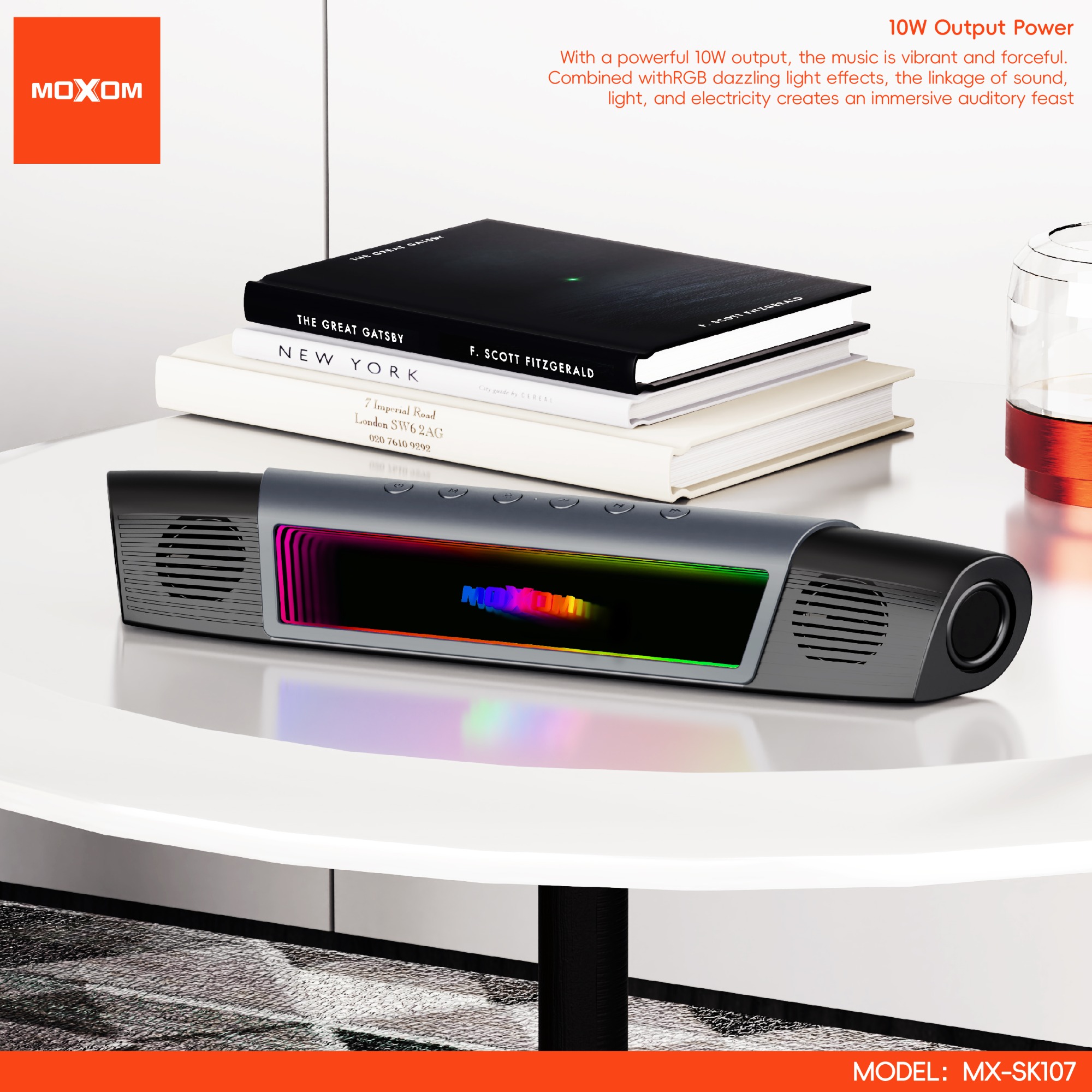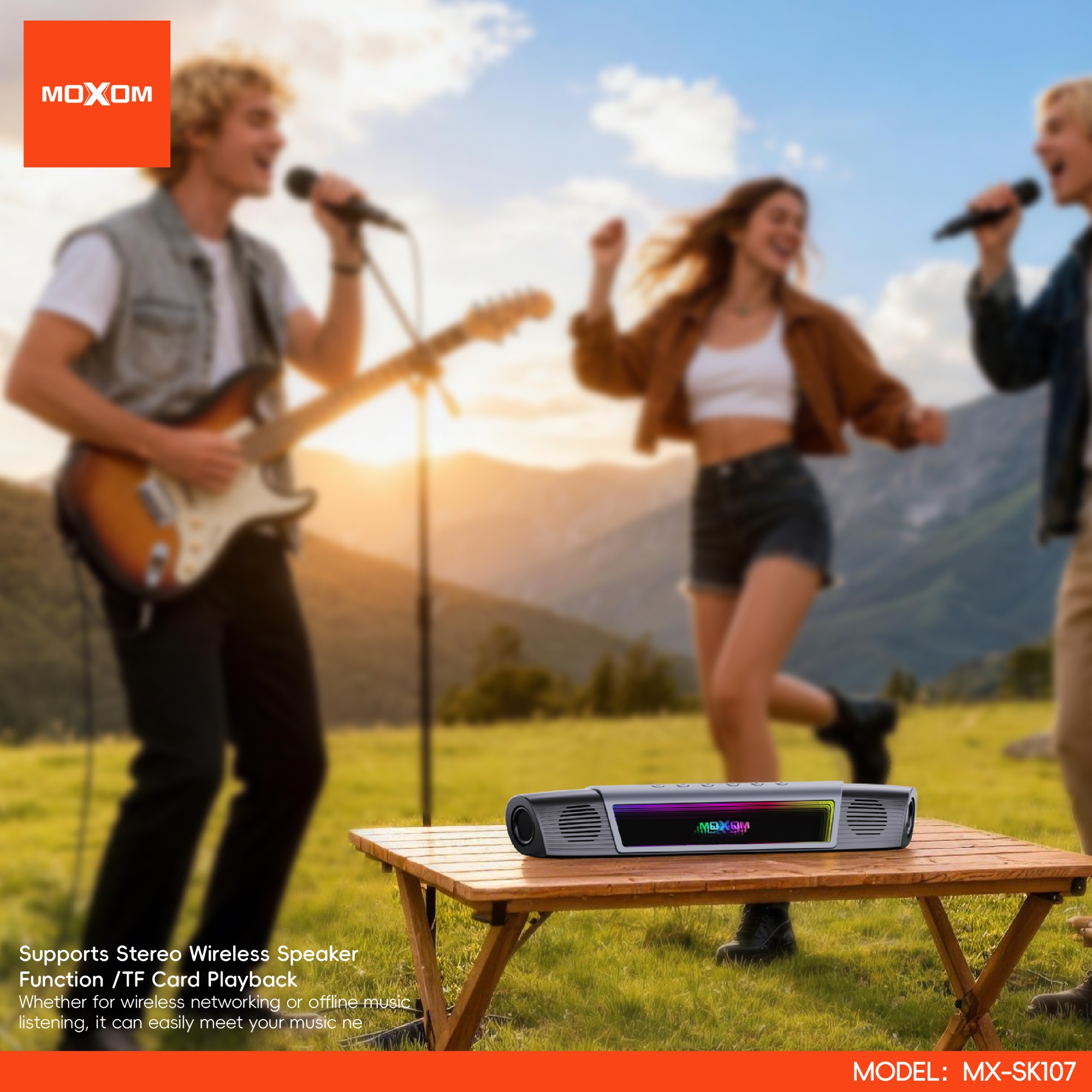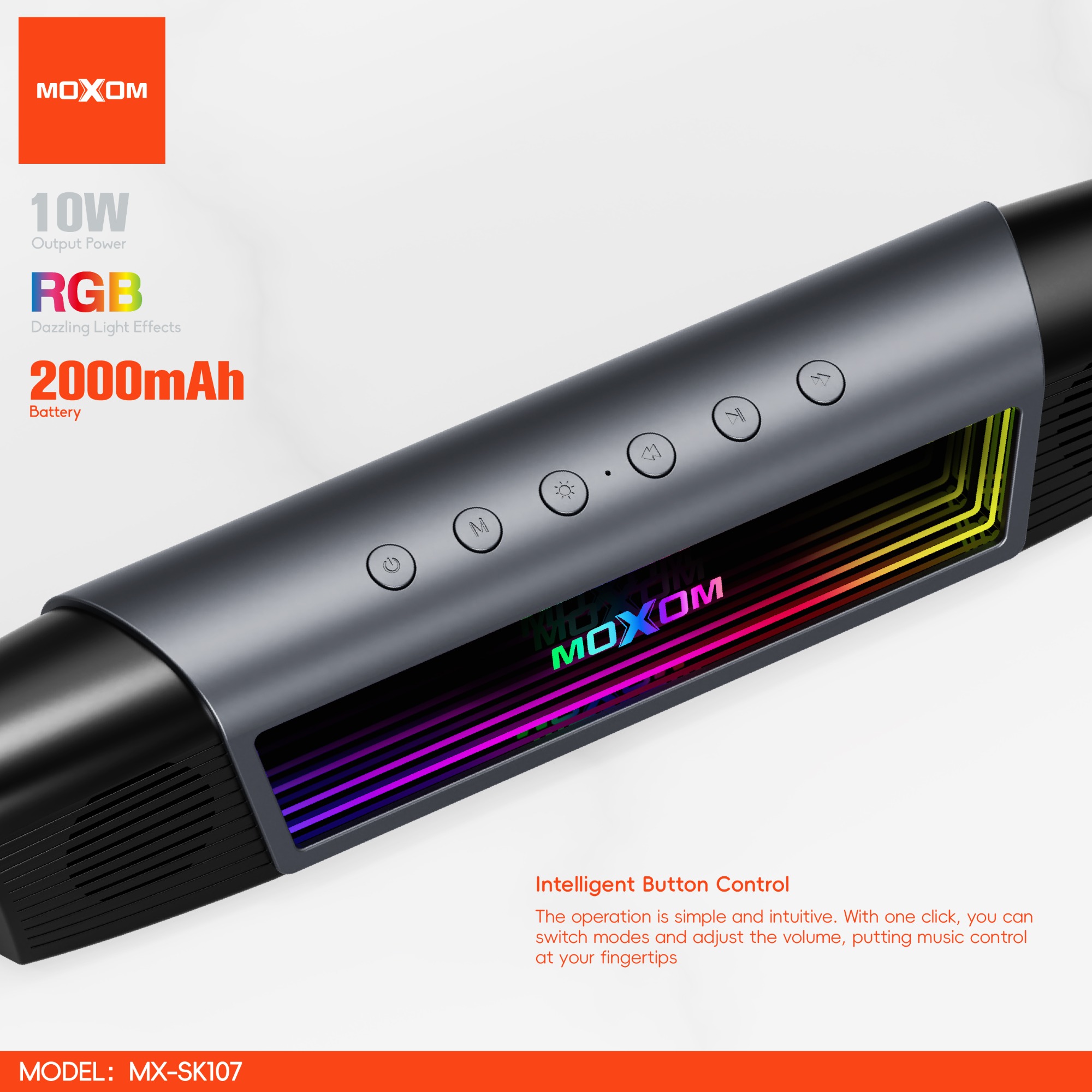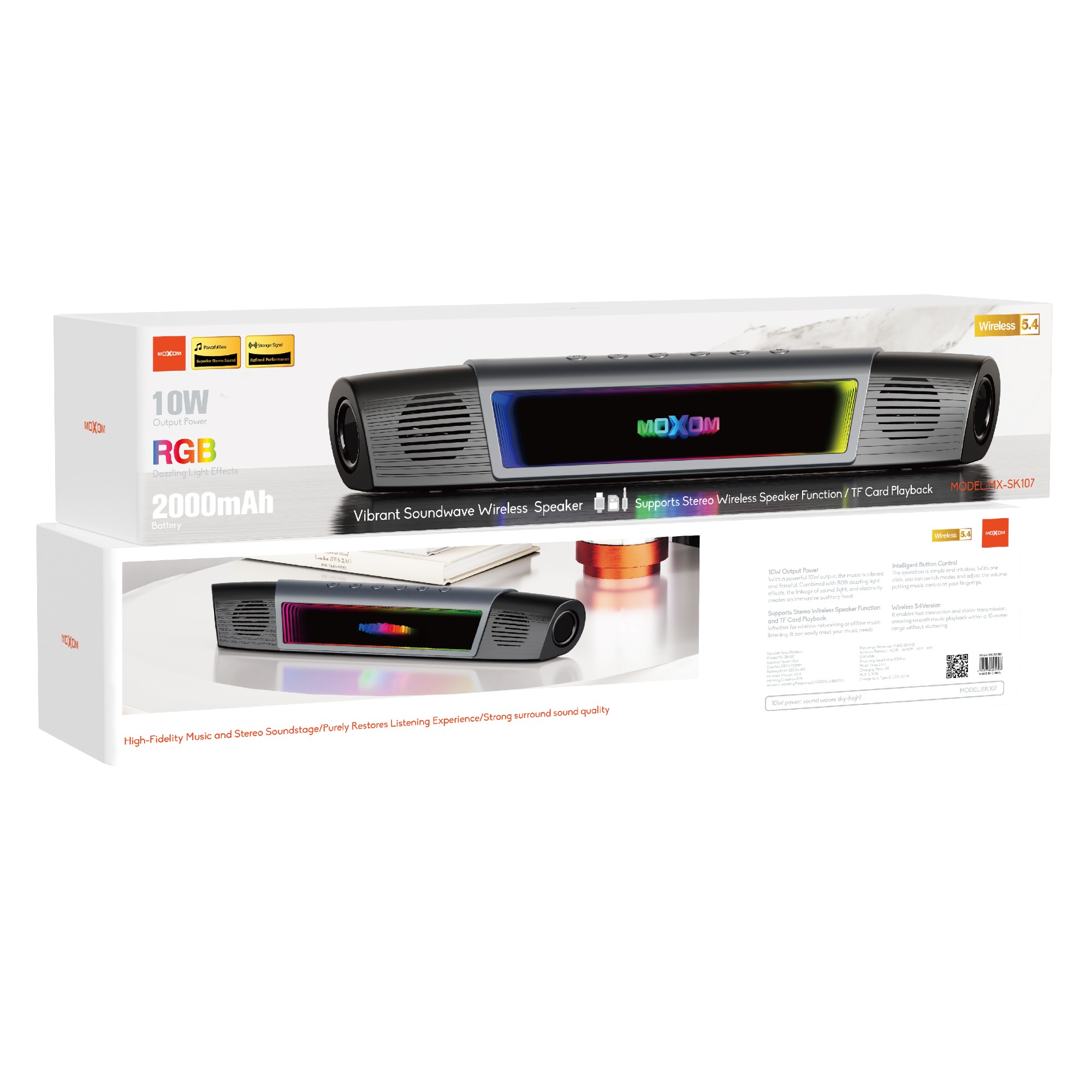 | Speaker Specification: Model:MX-SK107 Speaker Power:10W Size:465.5*83.5*77.5MM Battery:3.7V/ 2000mAH Wireless Version: V5.4 Working Distance:10M Wireless Working Frequency:2.402GHz-2.480GHz Frequency Response: 120HZ-20KHZ Wireless Protocol:A2DP、AVRCP、HSP、HFP S/N:63db Receiving Sensitivity:-80dBm Music Time: 2.5H Charging Time: 3H AUX: LININ Charge port: Type-C USB 5V 1A |